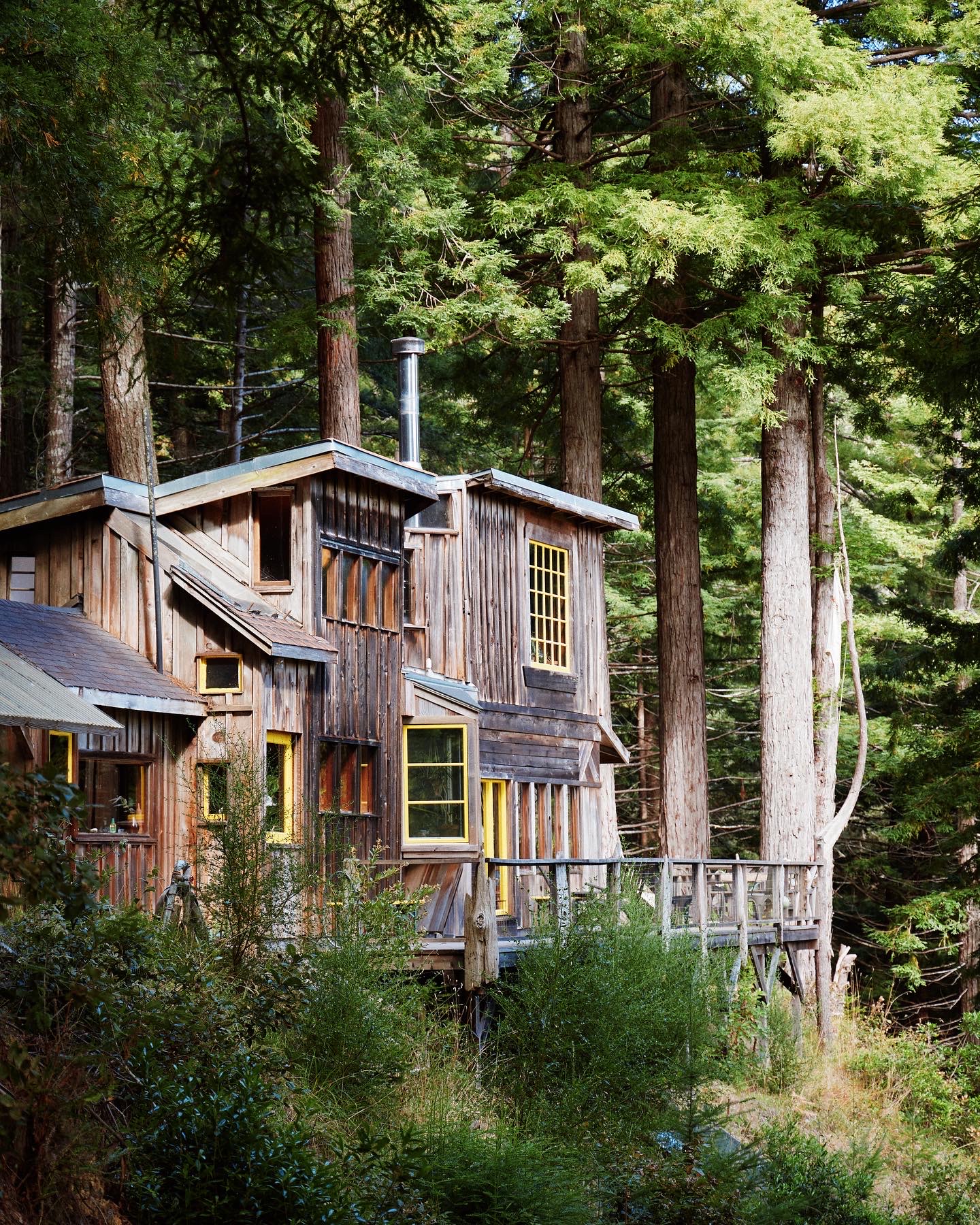 Cabins are reached by foot trails across 33 acres of south-facing coastal redwoods. Each occupies a unique secluded nook in our south-facing wooded slope. They are rustic (ie, a mouse may occasionally find it’s way in and something will need to be done) but they were lovingly built, rebuilt, repaired, furnished, and embellished by many hands over the years with scavenged and thrifted local materials.