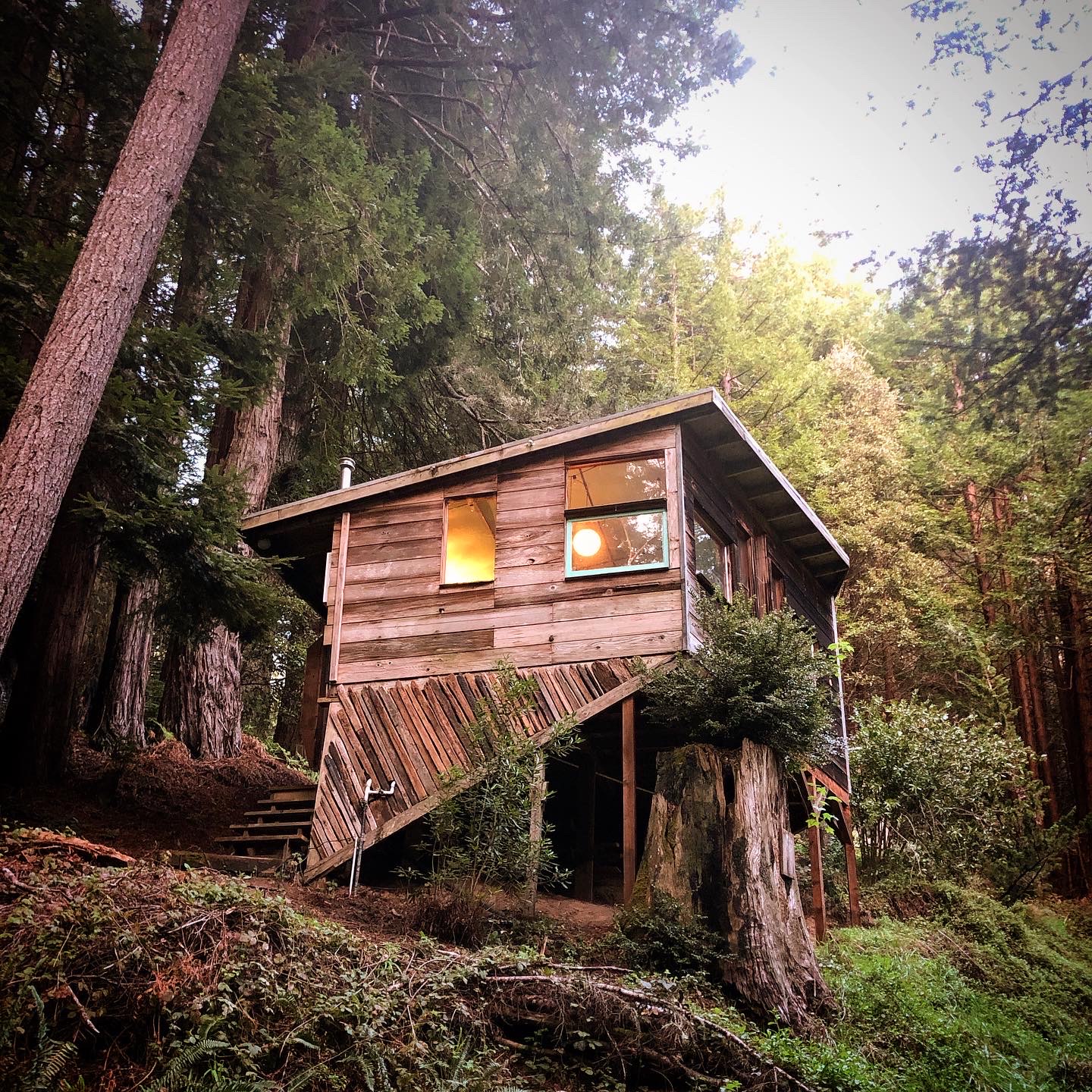 Our seven self-sufficient modest homespun guest cabins are reached by foot trails across 33 acres of south-facing coastal redwoods. Each occupies a unique secluded nook in our south-facing wooded slope. They were lovingly built, rebuilt, repaired, furnished, and embellished by many hands over the years with scavenged local materials. They are cute, cozy, comfortable, well appointed, and pretty rustic (ie. an occasional mouse may find it’s way in and something will have to be done). All feature equipped kitchenettes, new wood stoves, bedding/towels, hot outdoor showers, outhouses, and yes fast wifi.