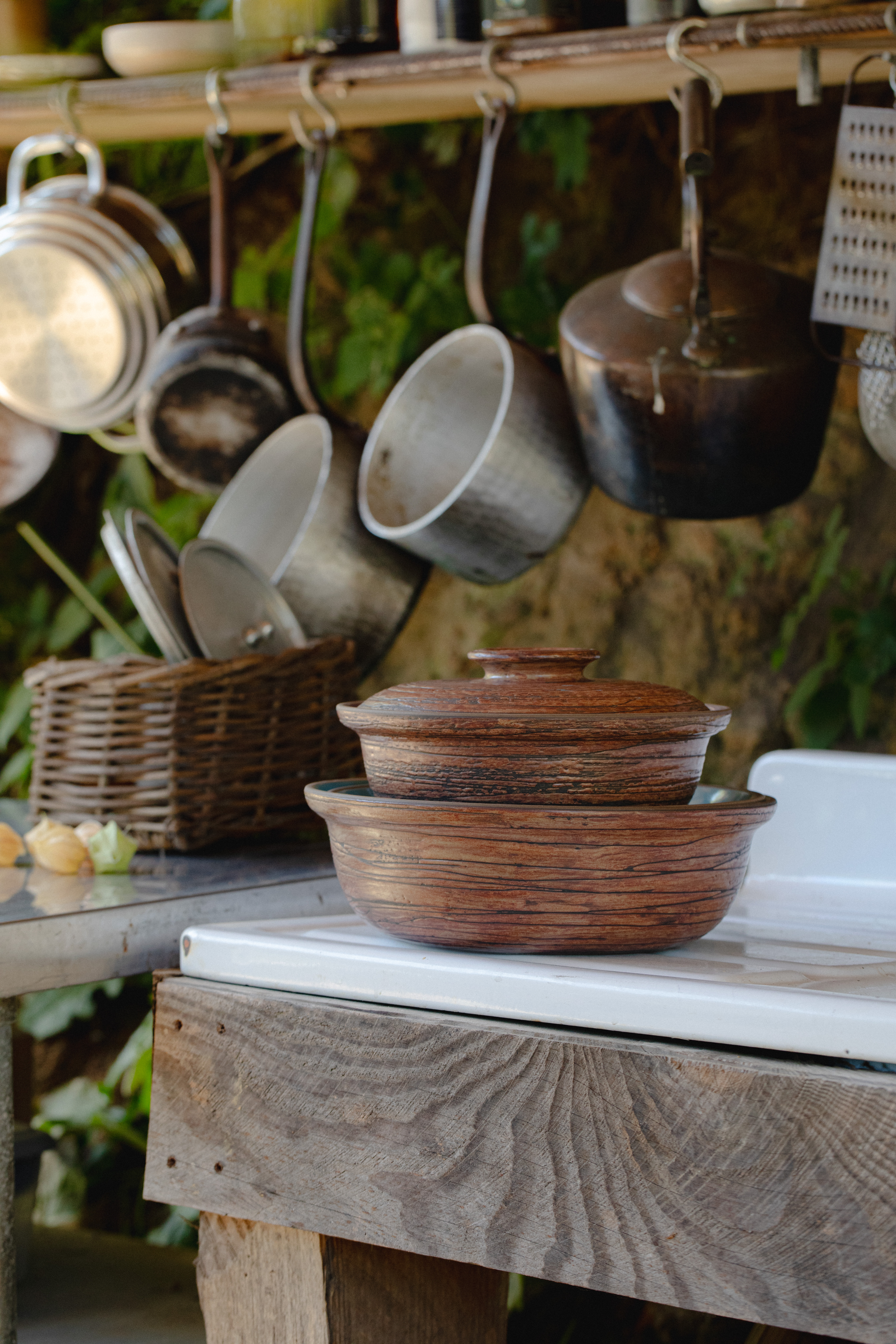 Salmon Creek Sharing Set with Heath Ceramics (2025, sold out) hand-glazed by Heath Master Glazer Winnie Crittenden, with exteriors emulating the warm rough character of the surrounding redwood bark contrasted with interiors of bright glossy glazes inspired by Salmon Creek's cabin trim colors.